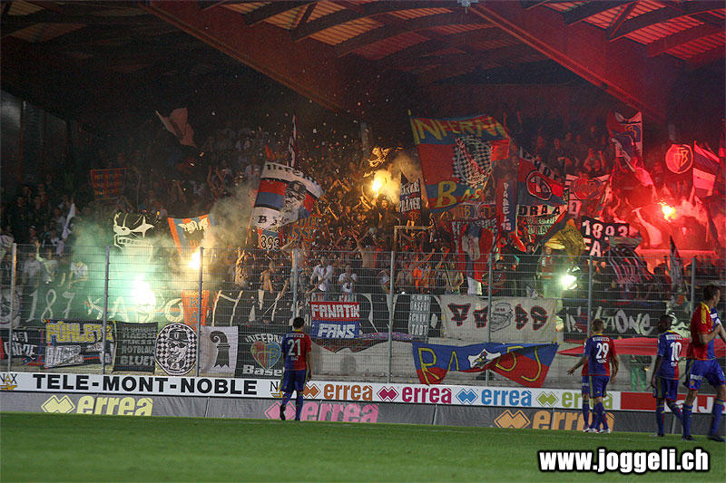 Jogo interessante a nível de bancadas na Suíça, tifos e muita pirotecnia dos dois grupos presentes...